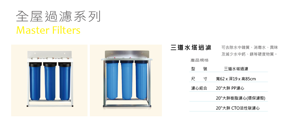 可去除水中雜質﹅消毒水﹅異味及減少水中鈣﹅鎂等硬度物質。