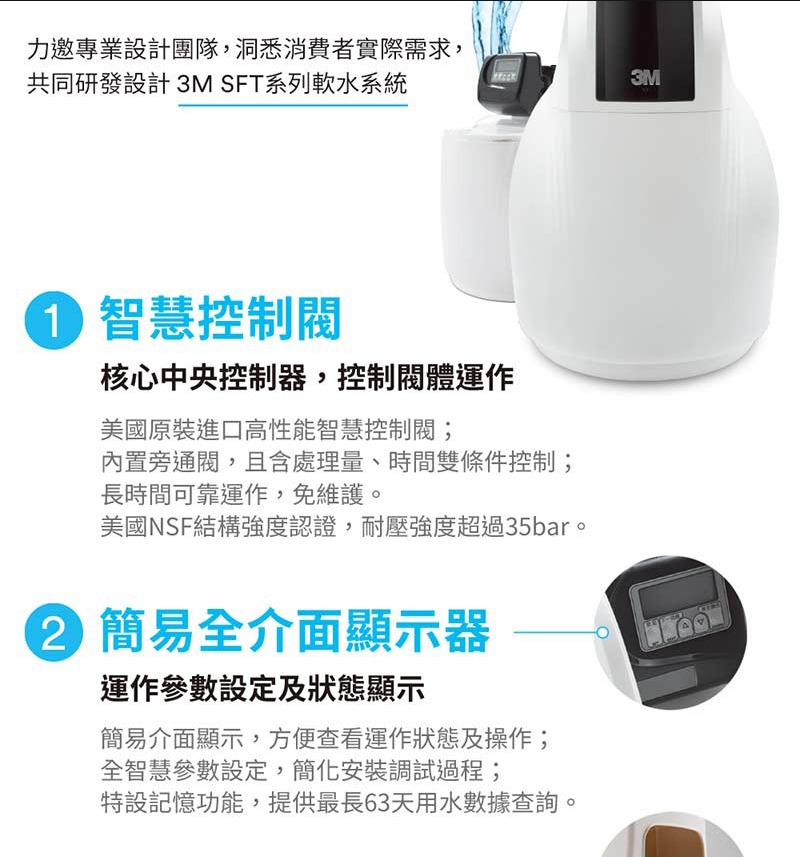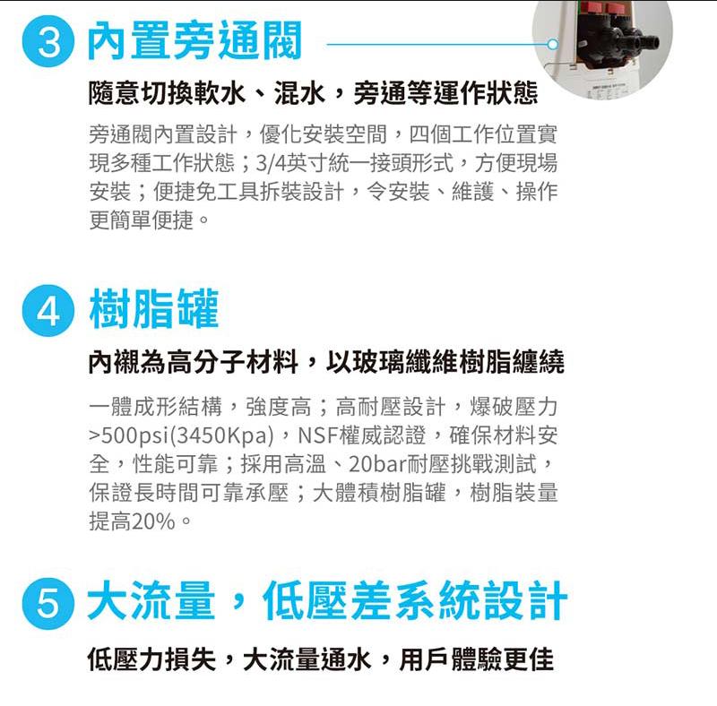 ◆美國原裝進口閥頭,時間與流量雙控制設定。持久安全的提供軟水。內置旁通閥,滿足不同需求多重用水組合。