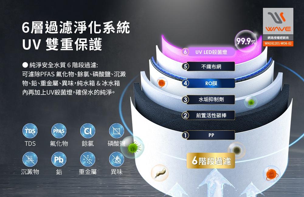 ◆6層過濾淨化系統 + UV 雙重保護:可濾除PFAS 氟化物、餘氯、磷酸鹽、沉澱物、鉛、重金屬、異味,純水箱&冰水箱內再加上UV殺菌燈,確保水的純淨。
