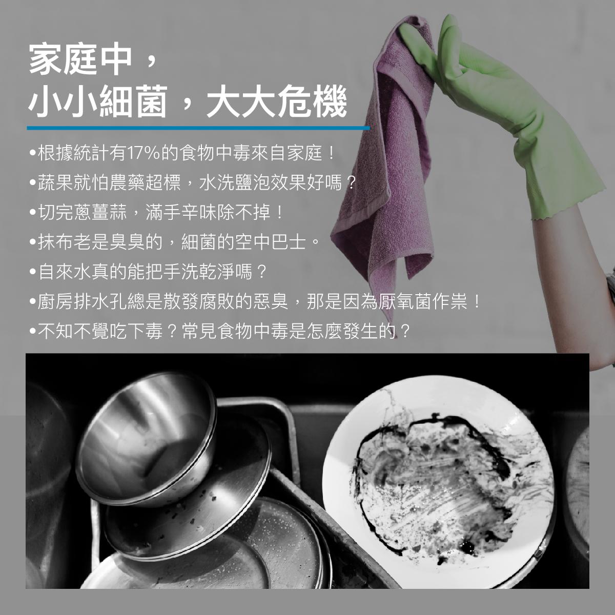 高效殺菌:殺菌效果達99.999%,有效對抗大腸桿菌、沙門氏菌、李斯特菌及其他病毒,提供比化學藥劑更安全的殺菌效果