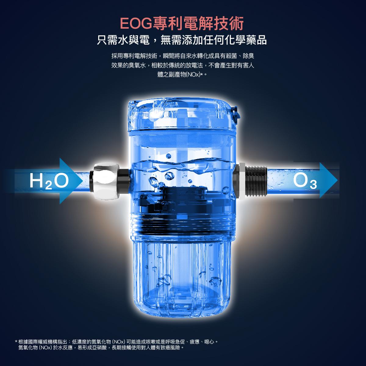 先進EOG專利電解技術:即時將自來水轉化為具殺菌、除臭效果的臭氧水,不產生對人體有害的副產物