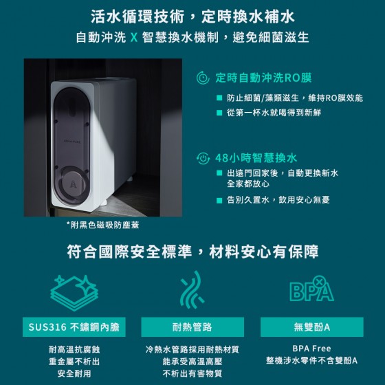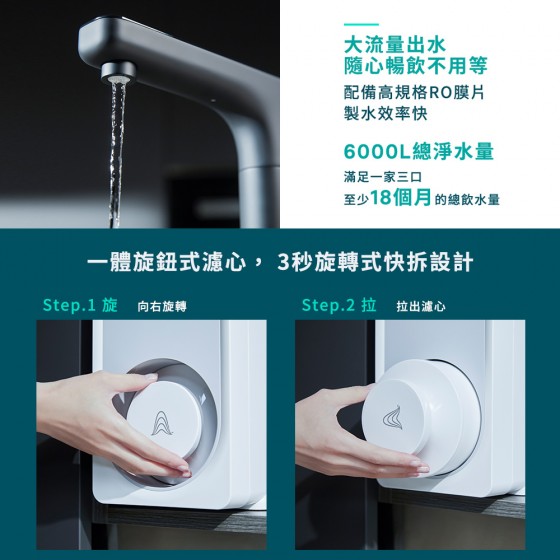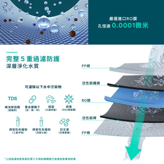 ◆五重濾材層層過濾,搭配600GPD RO膜,高效去除水中汙染物。